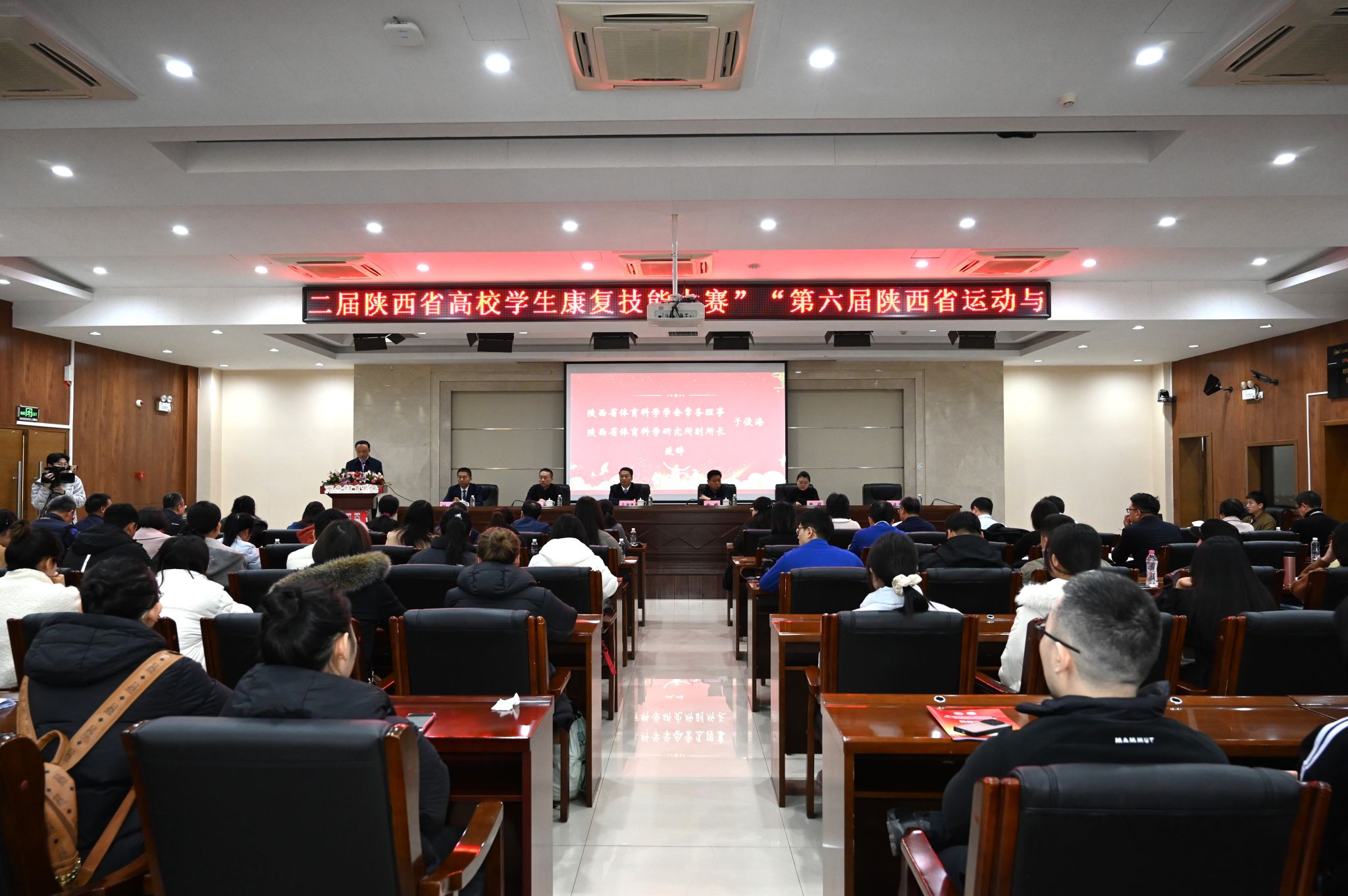 本网讯    11月30日,第六届陕西省运动与健康促进论坛暨陕西省第二届高校学生康复技能大赛在我校含光校区举办。陕西省体育局副局长徐鹏、我校党委副书记马海涛、陕西省体育局科教处副处长甄颖、陕西省体育科学研究所副所长于俊海、我校人事处处长刘涛等领导与嘉宾出席开幕式。开幕式由运动与健康科学学院院长刘军主持。