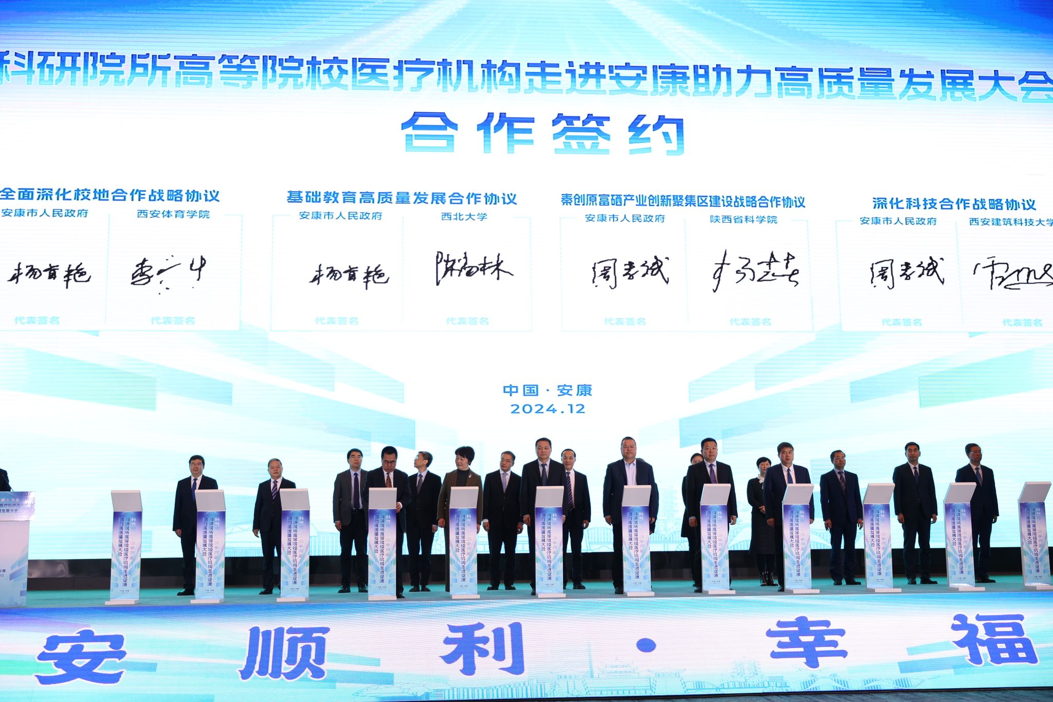 本网讯    12月2日,“科教赋能·携手共赢”科研院所高等院校医疗机构走进安康助力高质量发展大会在安康国际会议中心召开。安康市委书记武文罡,省科技厅厅长姜建春,省教育厅副厅长申雪峰、省卫生健康委副主任余立平致辞,中国科学院院士张涛出席并发言。中国科学院西安分院、中国药科大学、西北妇女儿童医院等110家科研院所、高等院校、医疗机构领导出席。校长李富生受邀参会,并作为陕西省高等院校唯一代表发言。