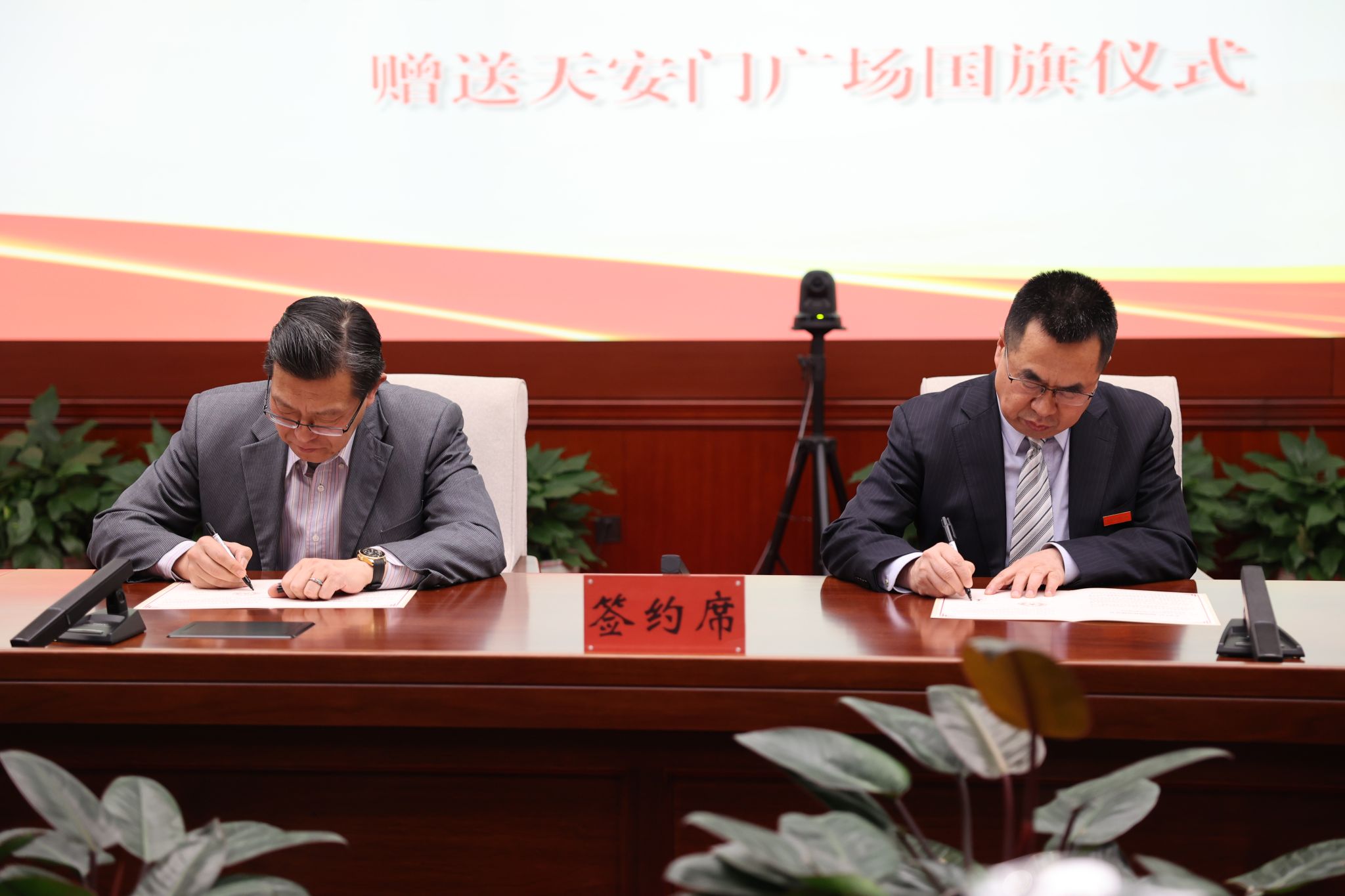 本网讯 12月13日下午,北京市天安门地区管理委员会向我校赠送国旗仪式在天安门地区管理委员会会议室举行。天安门地区管委会党组成员、副主任姚辉向学校赠送国旗,我校校长李富生代表学校迎请国旗,双方签订使用协议。我校获赠的是9月21日在天安门广场升起的国旗。在建校70周年之际获赠校庆日当天的国旗,对我校意义重大,将在学校校史馆永久珍藏。