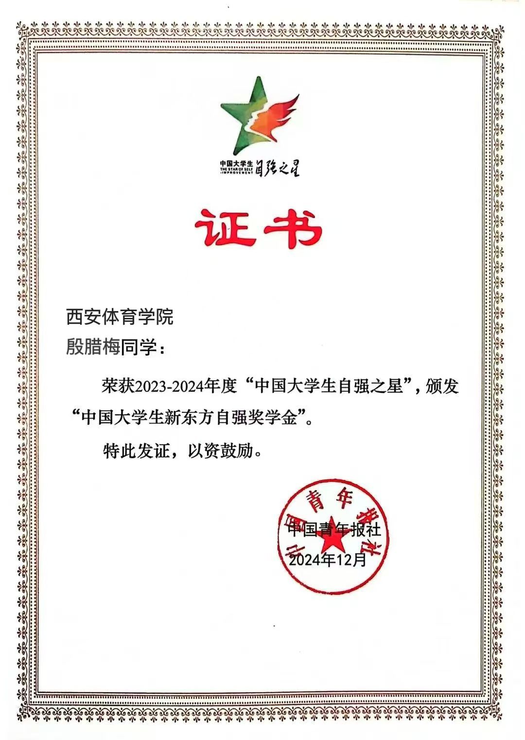 这一荣誉不仅是对殷腊梅个人努力和才华的肯定,也是对我校教育教学和人才培养工作的高度认可。“中国大学生自强之星”评选自2007年起已连续举办17年,共产生1.2万余名“中国大学生自强之星”,我校共有6名学生获此殊荣。本次推报活动以“自强自信 挺膺担当”为主题,旨在展现新时代中国青年有理想、敢担当、能吃苦、肯奋斗的风采。我校高度重视此次评选活动,深入挖掘、培育、选树、宣传一批自强自信自立的优秀青年人才,充分发挥先进典型的示范引领作用,激励西体青年汲取力量、追求卓越、接续奋斗、勇毅前行,积极展现青春作为、彰显青春风采,为学校高质量发展及中国式现代化实践贡献青春力量。