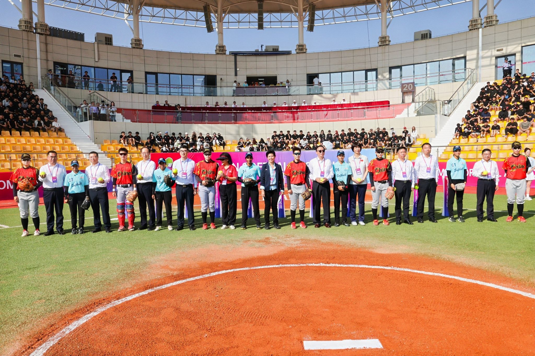 全体嘉宾与参加揭幕战的中国队与印度队运动员代表共同开球,标志着2025年女子垒球亚洲杯正式开赛。揭幕战东道主中国队率先登场,迎来与印度队较量。中国队目前世界排名第12,印度队排名第55。比赛一开始,双方就展开了激烈争夺。1局下半,中国队颜思语打出三垒安打击穿对手左外场,随着谢悦再次敲出安打,中国队率先得分。随后中国队愈战愈勇,队员们进攻端积极主动气势如虹,不断下分,防守端一次次成功化解印度队的进攻。3局下半中国队已领先15分,根据“提前结束规则”(mercy rule),中国队15-0战胜印度队取得开门红。