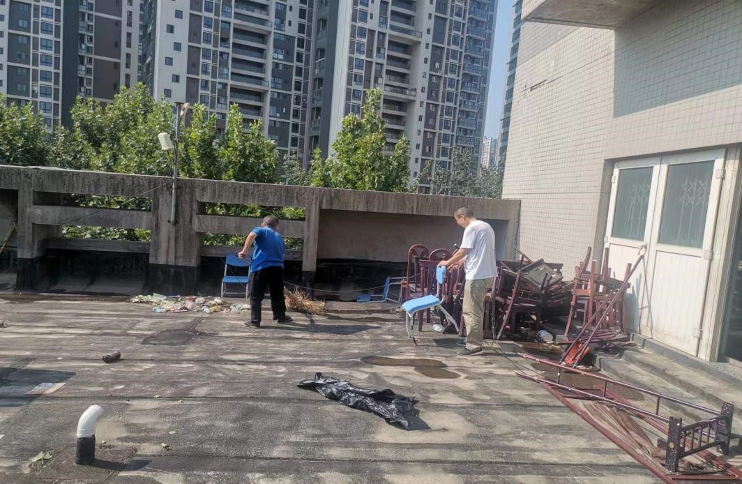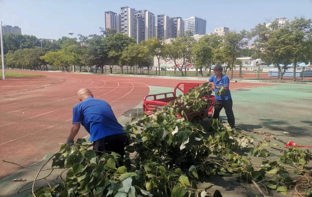 暴雨发生以来,后勤管理处(集团)班子成员以身作则靠前指挥,物业、水电、维修等部门全体工作人员始终坚守在一线,对全校进行全方位防守、全天候巡查,反应敏锐,处突抢险有力,及时发现和处置各类安全隐患,做到了险情早发现、早处置、早化解。以场馆运营中心及物业公司为依托,其他各中心协同开展安全风险点巡查,发现问题及时报告、及时安排处置;以修缮中心及物业服务公司为依托,其他各中心协调配合,通过调集抢险处置人手,利用所备各种防汛物资、工具科学开展防汛抢险的工作。暴雨过后,教学保障中心物业人员迅速行动起来对田径场、全校各处刮断的树枝、餐厅四楼屋顶的淤泥、场馆内残留的积水污渍进行了清理。