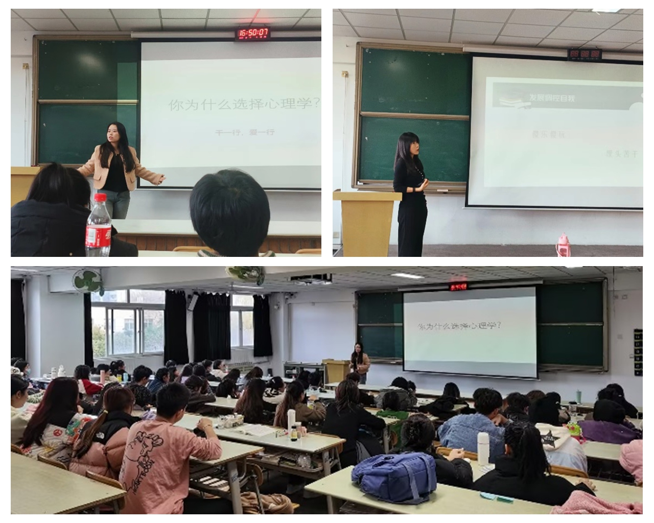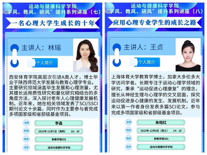 讲座分别邀请到了青年博士教师林瑶和王贞分别以《一名心理大学生成长的十年》《应用心理学专业学生的成长之路》为题,旨在为应用心理学专业学生提供看得见够得着的榜样,帮助其完成向大学生的角色转变,明确大学生活的目标和任务。此举也为高层次引进博士快速融入学院起到了助推作用。报告由应用心理学教研室支部书记李晶博士和应用心理学专业负责人朱昭红博士分别主持。