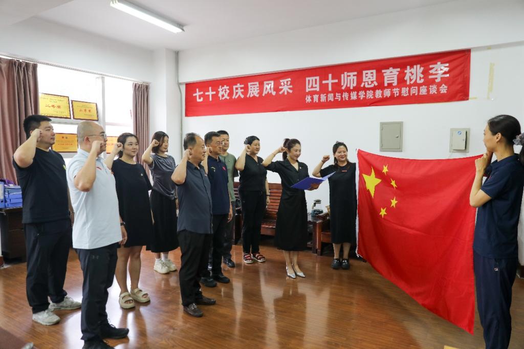 座谈会以“七十校庆展风采,四十师恩报桃李”为主题。学院书记马增强在致辞中向辛勤奋斗在一线的教职工表示慰问,参会人员回顾了“我与西体”共同走过的日子,分享教学经验和感悟,表示西体见证了自己的青春岁月,今后将以更加饱满的热情投入到工作中,为学校的七十周年校庆增光添彩,为培养更多优秀的体育新闻与传媒人才贡献自己的力量。学院教师齐聚在庄严的国旗下进行宣誓并重温人民教师宣言:“我志愿成为一名人民教师,忠诚党的教育事业,遵守教育法律法规,履行教书育人职责……”誓言铿锵有力,再次激起了教师的责任感和使命感,也为教师节增添了一份庄重与神圣。