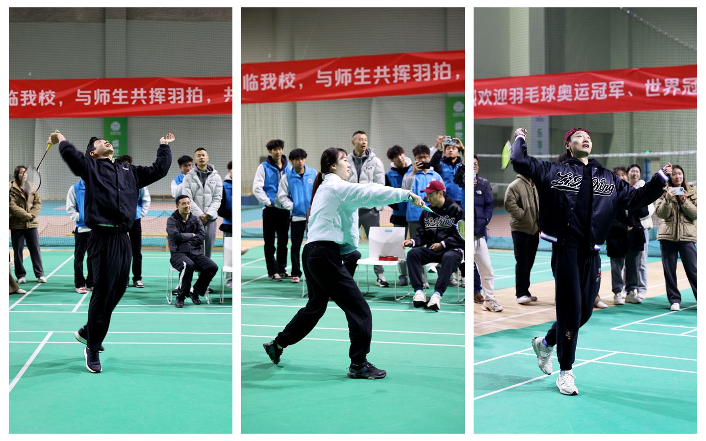 本网讯 为进一步提升我校体育运动氛围,激发广大师生的体育精神与运动热情,11月24日,我校在鄠邑校区羽毛球馆举行“羽动梦想,冠军同行——羽毛球奥运、世界冠军西体行”活动。活动邀请了2008年北京奥运会羽毛球混双冠军李龙大(韩国)、2016年里约奥运会男双冠军张楠、2015年苏迪曼杯冠军徐晨、2021年十四运羽毛球女子双打冠军杜玥、2007年香港羽毛球锦标赛男单冠军胡赟(中国香港)、2023年全国锦标赛团体冠军庄怡、2024年全国羽毛球单项冠军赛女双冠军冯雪颖7位羽毛球奥运、世界冠军莅临学校与师生交流。